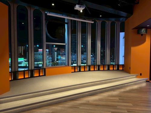 ステージ完備!各種発表会や結婚式二次会にも最適☆スポーツクラブ壮行会などにも大型モニターで試合映像を移したりと幅広くご使用いただけます。